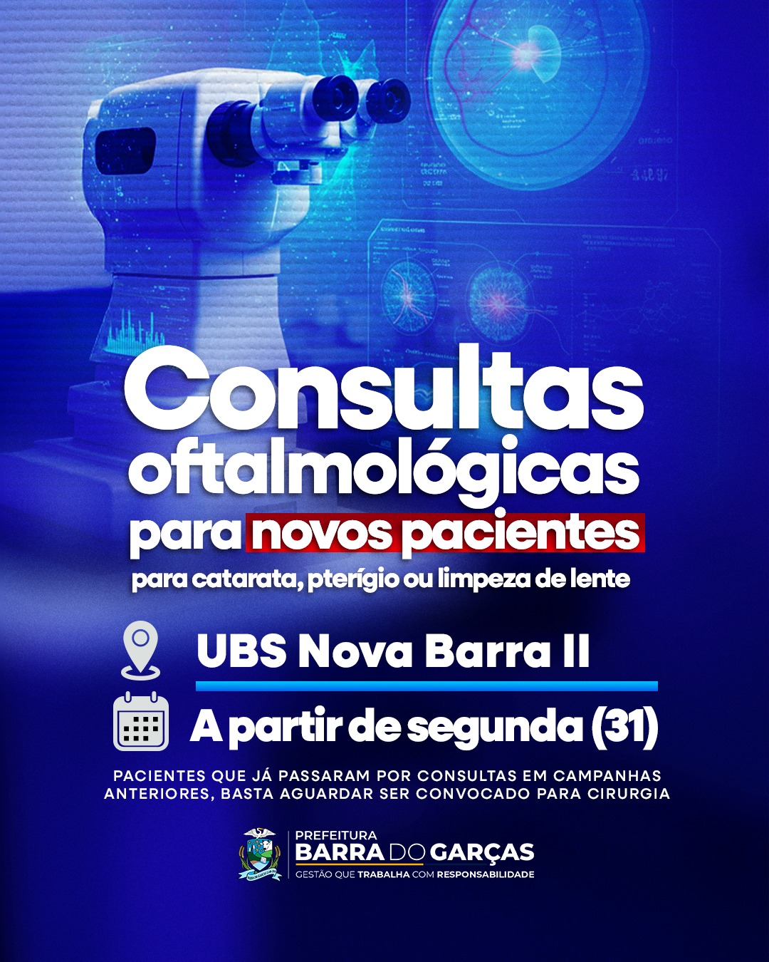 A Prefeitura de Barra do Garças, por meio da Secretaria de Saúde, inicia nesta segunda-feira (31) uma campanha de consultas oftalmológicas, na Unidade Básica de Saúde (UBS) Nova Barra II.