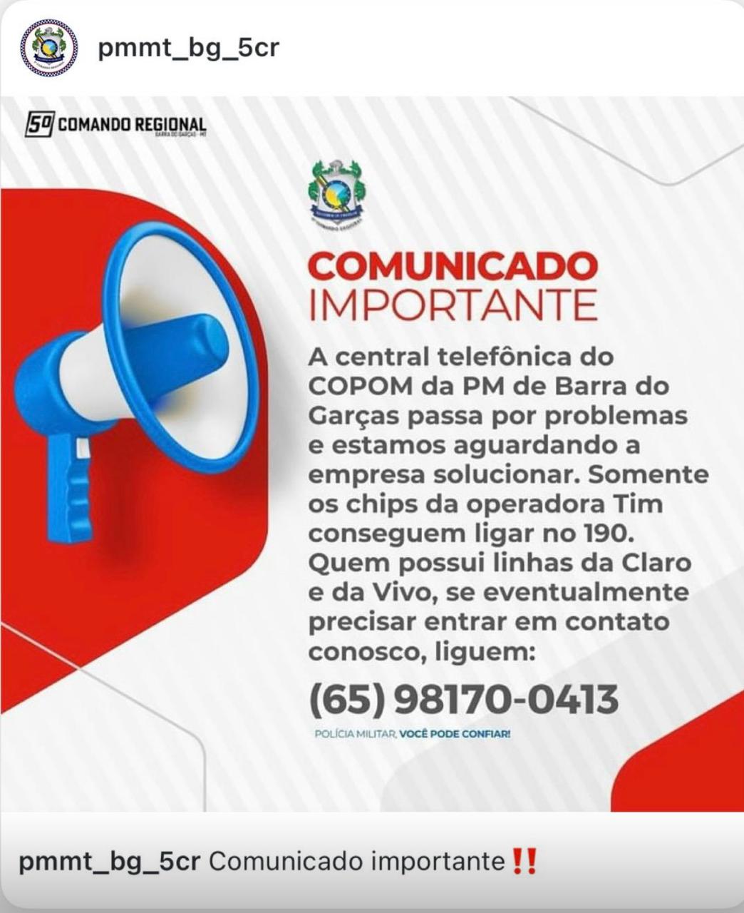 Em comunicado via redes sociais- Instagram, o COPOM da PM de Barra Do Garças, passa por problemas técnicos, nas operadoras (Claro, Vivo), eventualmente precise entrar em contato com a PM liguem com a guarnição liguem: (65) 98170-0413. Chip da Tim apenas esta funcionando o 190.