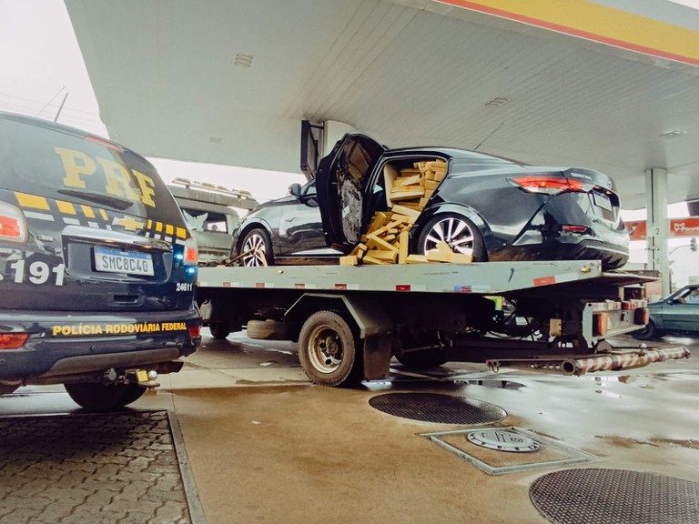 No automóvel os policiais encontraram grande quantidade de maconha e descobriram que as placas utilizadas eram falsas. O carro possuía registro de furto, desde fevereiro de 2025, em Brasília (DF).