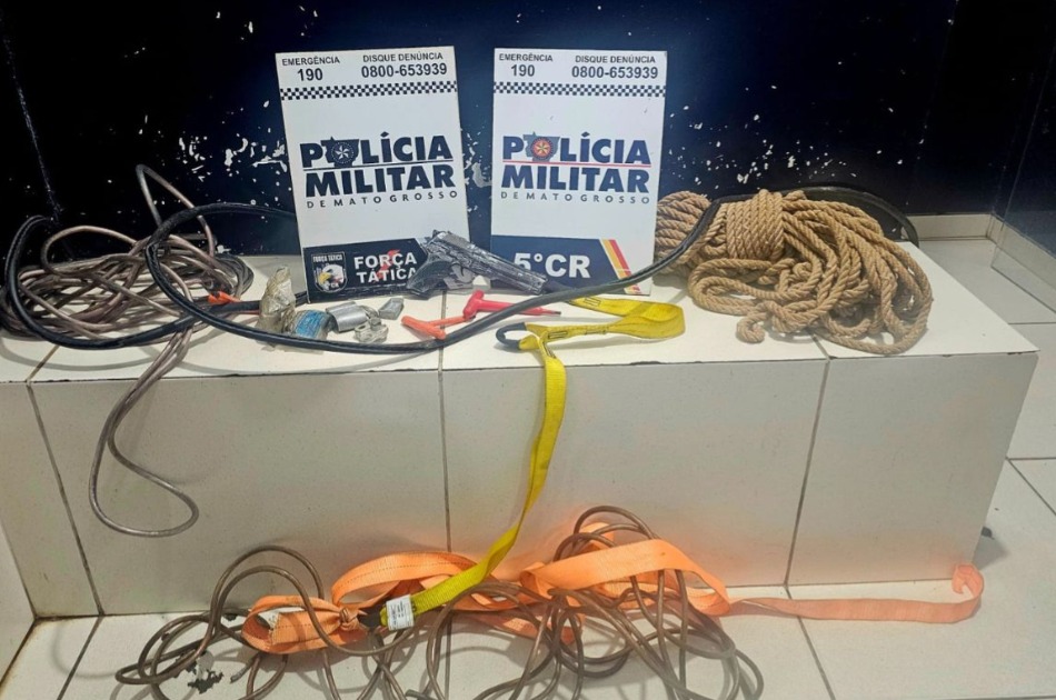 Em continuidade à ação, os policiais se deslocaram até a residência do suspeito, onde localizaram diversos materiais de origem suspeita, entre eles: cabos de fiação de alta tensão, chaves de uso técnico, fitas de segurança da empresa, além de um simulacro de arma de fogo.