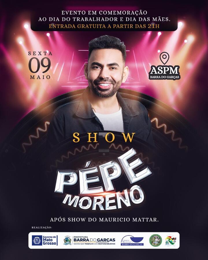 O cantor Pepe Moreno, conhecido nacionalmente pelos sucessos “Menino de Rua”, “Americana”, “Boca do Lixo” e “Risca Faca”, será a segunda atração da festa em homenagem aos Trabalhadores e às Mães, que acontece no próximo dia 09, na Associação dos Servidores Públicos Municipais (ASPM), em Barra do Garças.