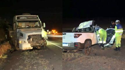 Acidente de trânsito envolvendo colisão entre uma carreta Volvo NH e uma Fiat Strada vitimou um homem de 32 anos condutor do veículo de passeio na madrugada deste sábado (5) na BR-163 sentido Sinop (MT). Com o impacto a frente dos veículos ficou completamente destruída. Informações apuradas indicam que possivelmente o motorista do carro pode ter dormido ao volante. As causas serão apuradas.