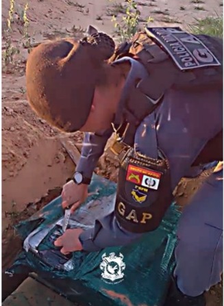 Durante as buscas, os policiais localizaram uma caminhonete Chevrolet S10, e flagraram o suspeito, manuseando vários fardos verdes, em um buraco no chão, próximo à pista clandestina.