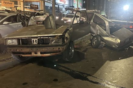 Dois carros ficaram completamente destruídos em um acidente, após um suposto racha envolvendo três veículos, na noite de quinta-feira (24), na Avenida Miguel Sutil, em Cuiabá.