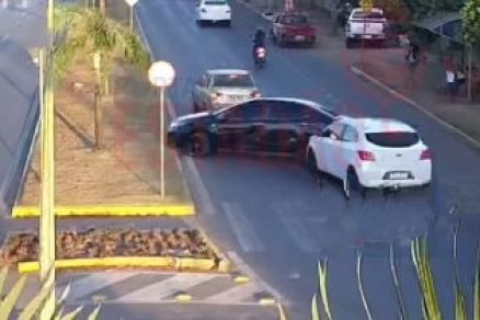 As imagens mostram quando o homem, que conduzia um Chevrolet Onix branco, colidiu na lateral traseira do Toyota Corolla preto dirigido pela vítima. Ela, então, perdeu o controle da direção e atravessou o canteiro central, parando na pista contrária.