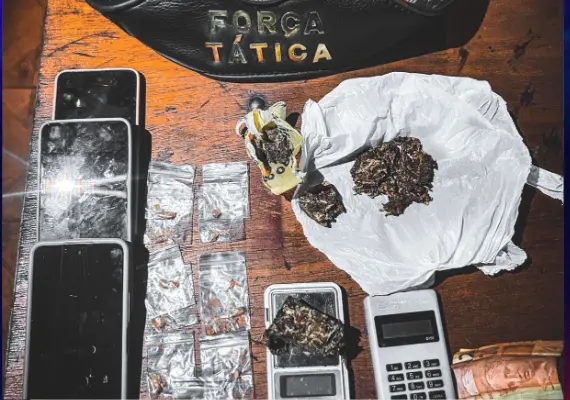 Durante a abordagem, os policiais localizaram diversas porções de entorpecentes e objetos relacionados à atividade criminosa. Também foi apreendida uma motocicleta que, segundo a corporação, pode ter sido utilizada no transporte das drogas.