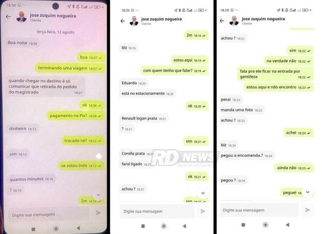 Nos prints, é possível ver a negociação. O suspeito utilizava uma conta falsa, com nome e foto do desembargador Zuquim, num aplicativo de entregas. O entregador pergunta com quem deve falar e o suspeito responde que é com Eduardo, que está no estacionamento.