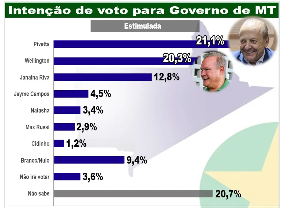 A 14 meses para as eleições, o vice-governador Otaviano Pivetta (Republicanos) e o senador Wellington Fagundes (PL) se despontam na liderança e empatados tecnicamente nas intenções de voto ao governo estadual.