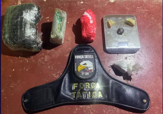 A ocorrência se deu por volta das 23h, quando os militares identificaram movimentação suspeita em uma residência. Durante a abordagem, foi confirmada a prática criminosa e localizada grande quantidade de entorpecentes. Além disso, os policiais constataram adulteração em um veículo utilizado pelos indivíduos.