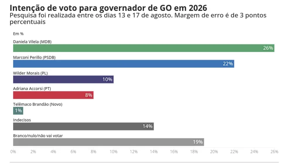 O levantamento foi contratado pela Genial Investimentos e feito entre os dias 13 e 17 de agosto. Foram ouvidos 1.104 eleitores de Goiás com 16 anos ou mais. O nível de confiança é de 95%.