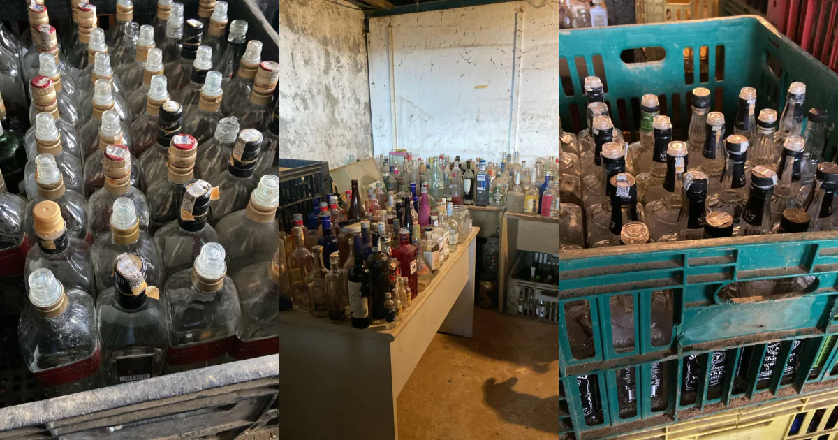Os policiais localizaram um galpão que funcionava como depósito não autorizado de vasilhames de bebidas alcoólicas. Os frascos estavam organizados por marca e, durante a operação, os agentes flagraram funcionários realizando higiene nas garrafas, procedimento que sugere preparo para nova composição e posterior comercialização.