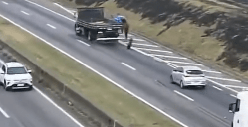 Um vídeo que circula nas redes sociais mostra o momento em que um pneu, que havia se soltado de um caminhão, atinge um romeiro na Rodovia Via Dutra, em São José dos Campos, no interior do estado. O homem não se feriu.