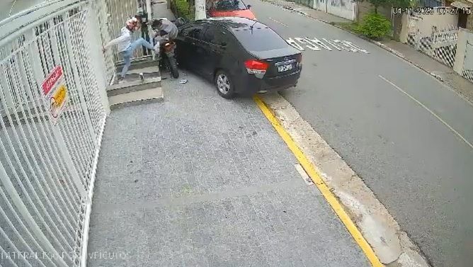 O pedestre, de 43 anos, caminhava pela rua quando sofreu a tentativa de assalto. Dois homens o abordaram em uma motocicleta, um deles desceu armado e demandou o celular e fugiram com o aparelho. O motorista do carro viu o ação e lançou o carro contra os suspeitos, prensando a moto contra uma parede.