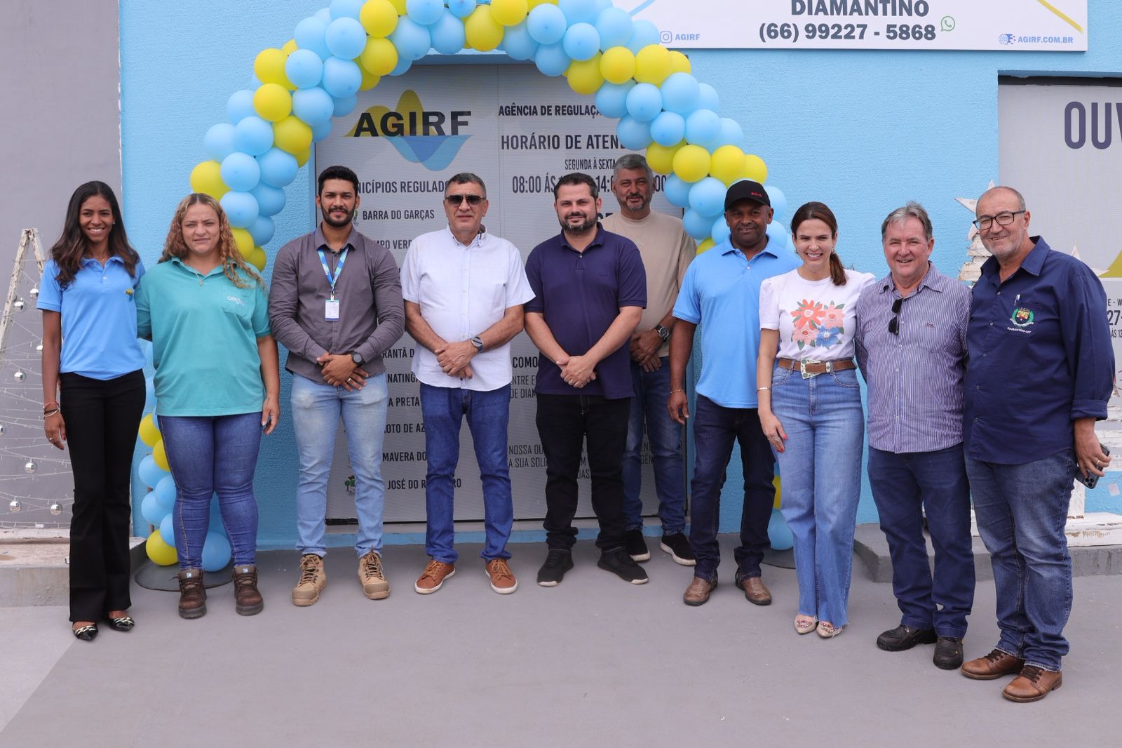 A cerimônia de inauguração contou com a participação de diversas autoridades locais, reforçando a importância da chegada da agência ao município. Entre os presentes estavam o prefeito Francisco Ferreira Mendes, o gerente da Águas de Diamantino, Denner Pereira, a responsável técnica Ellen, o secretário Jefersson Grolli, a vereadora Michelly Carrasco, o secretário de Agricultura Milton Crivelleto e o secretário de Infraestrutura e Obras Leonildo José. A presença de representantes políticos, técnicos e comunitários demonstrou o apoio institucional e o reconhecimento da relevância da AGIRF para a região.
