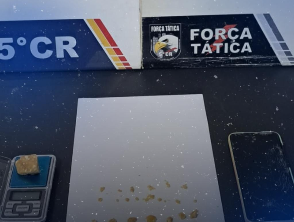 Durante a busca, os policiais localizaram uma sacola plástica contendo uma pedra média e várias porções menores de pasta base de cocaína, totalizando aproximadamente 16,5 gramas, além de uma balança de precisão. O suspeito assumiu ser o proprietário do entorpecente. Também foram apreendidos dinheiro e um aparelho celular.