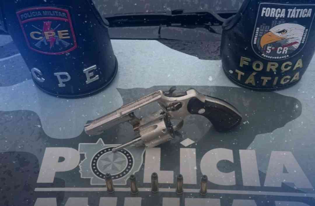 Durante a abordagem, foi constatado que um dos indivíduos portava uma arma de fogo tipo revólver, calibre .38, municiada. Diante do flagrante, ambos receberam voz de prisão.