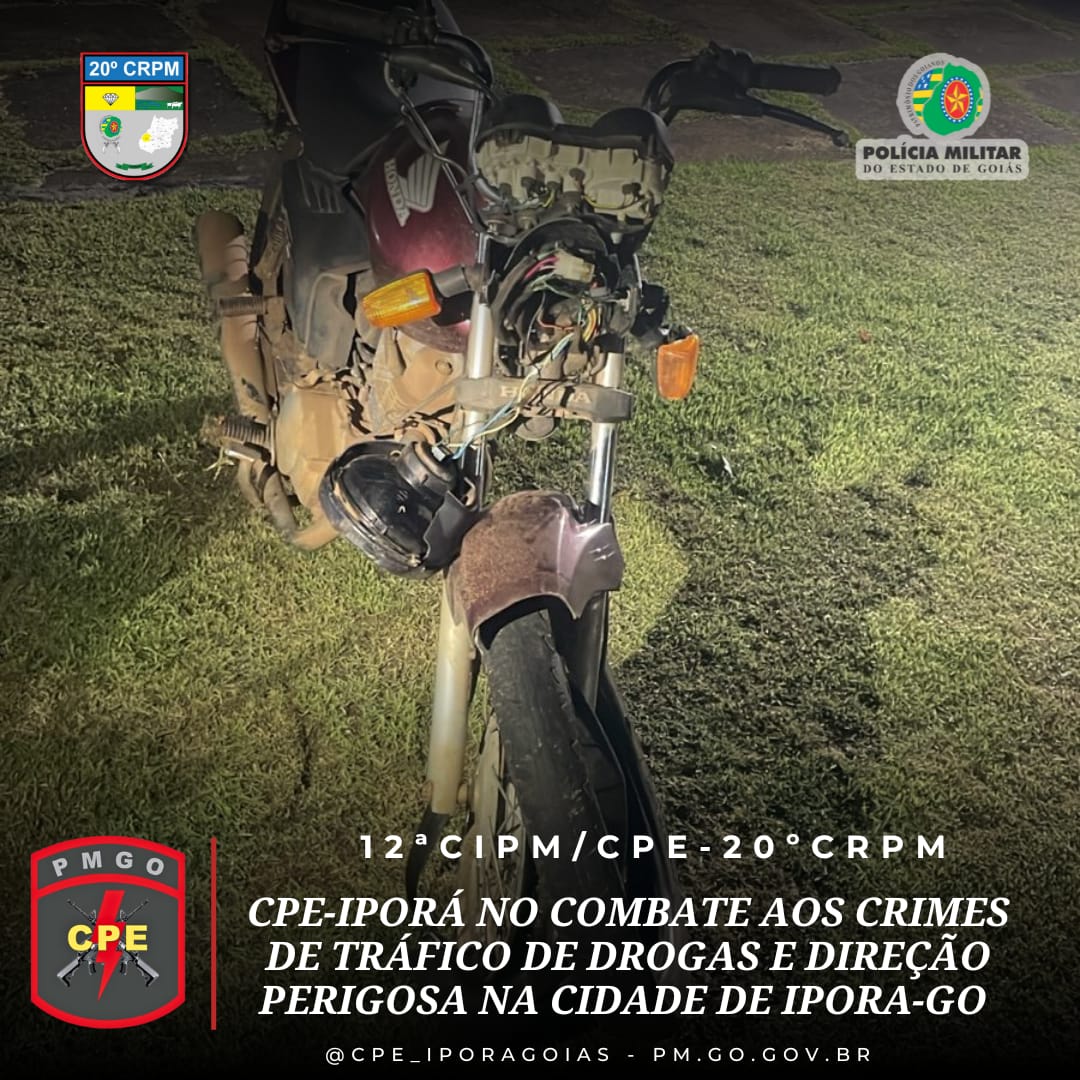 A equipe CPE 90, em patrulhamento, visualizou uma motocicleta com dois indivíduos que, ao avistarem a viatura, empreenderam fuga. Durante acompanhamento, perderam o controle da moto e colidiram em uma rotatória, em Iporá/GO.