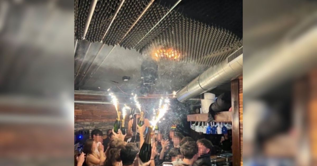 Uma foto amplamente divulgada mostra pelo menos seis fontes de brilho acesas erguidas no bar lotado, enquanto o fogo começa no teto forrado com espuma acústica acima.