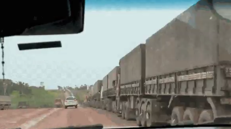 Uma fila de carretas com soja mato-grossense se estende por aproximadamente 25 quilômetros no Arco Norte, que fica a caminho do Porto de Miritituba, no Pará, nesta segunda-feira (23).