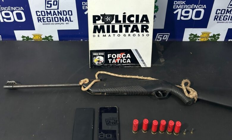 Policiais militares da Força Tática do 5º Comando Regional localizaram e prenderam um foragido da Justiça, de 42 anos, na zona rural do município de Barra do Garças. As equipes apreenderam com o denunciado uma espingarda seis munições calibre 16 e outras duas calibre .22.