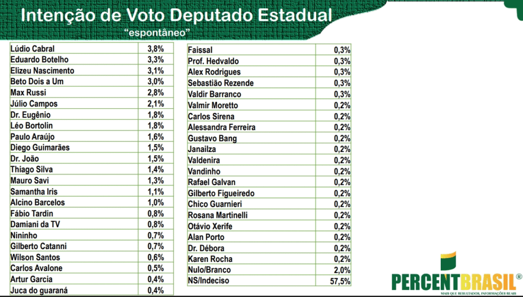 Uma pesquisa feita pelo instituto Percent Brasil, divulgada nesta segunda-feira (23), apontou os principais nomes lembrados pelos eleitores para o cargo de deputado estadual em Mato Grosso.