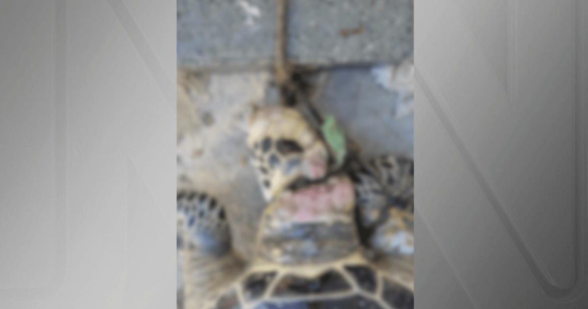 Uma tartaruga-verde foi encontrada morta com uma corda no pescoço amarrada a um bloco de concreto na Praia do Plaza, em Itapema, litoral de Santa Catarina, no dia 18 de fevereiro de 2026.