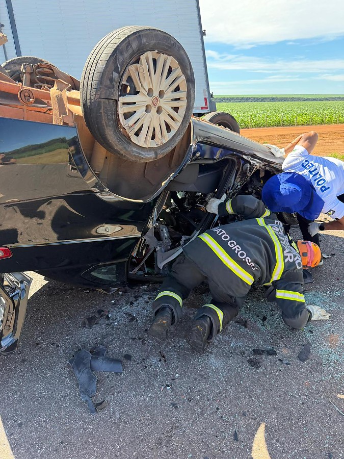 Segundo o relato, o condutor do Siena colidiu inicialmente com o caminhão baú e, na sequência, atingiu a lateral da carreta. Com o impacto, o veículo de passeio capotou, deixando o motorista preso às ferragens.