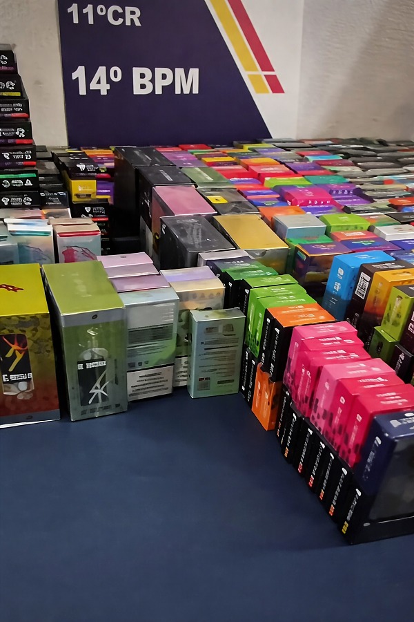 Durante as buscas, foram localizadas 754 unidades de cigarros eletrônicos (vapes), todos de origem estrangeira e sem qualquer tipo de documentação fiscal. A comercialização desse tipo de produto é proibida no Brasil, conforme regulamentação da Agência Nacional de Vigilância Sanitária (Anvisa).